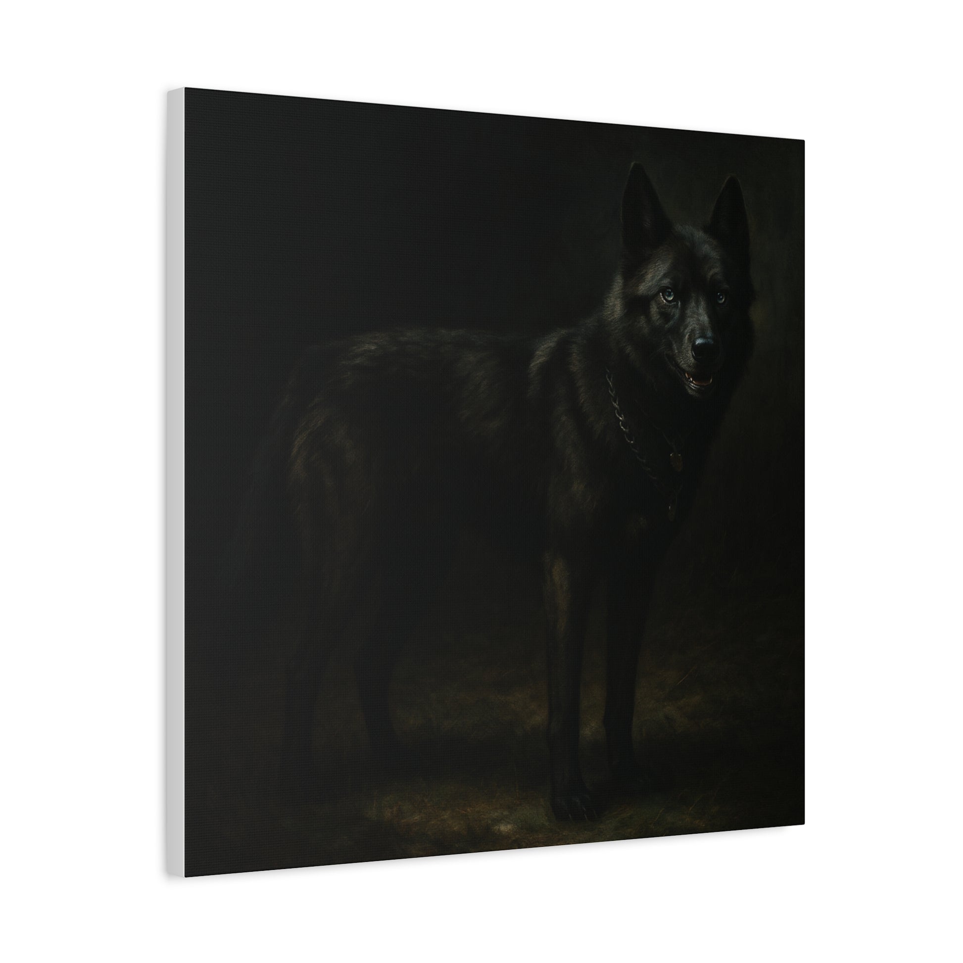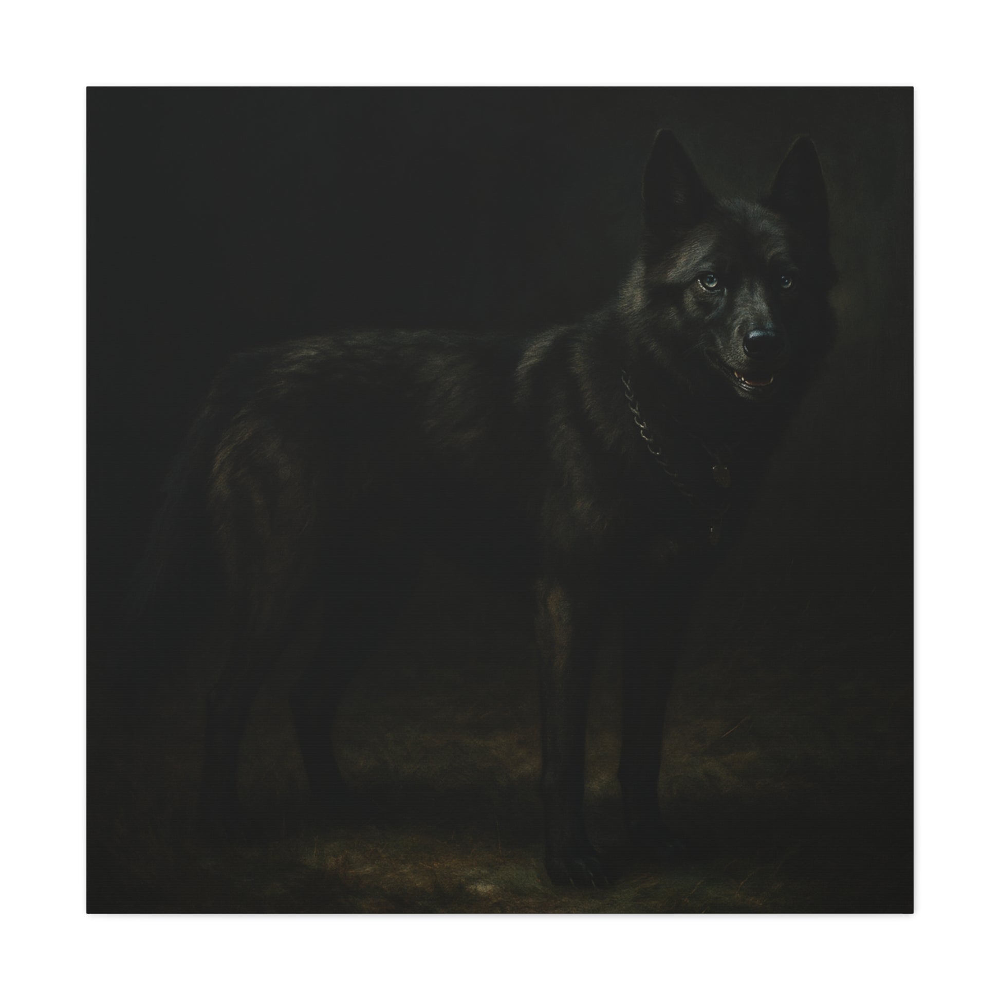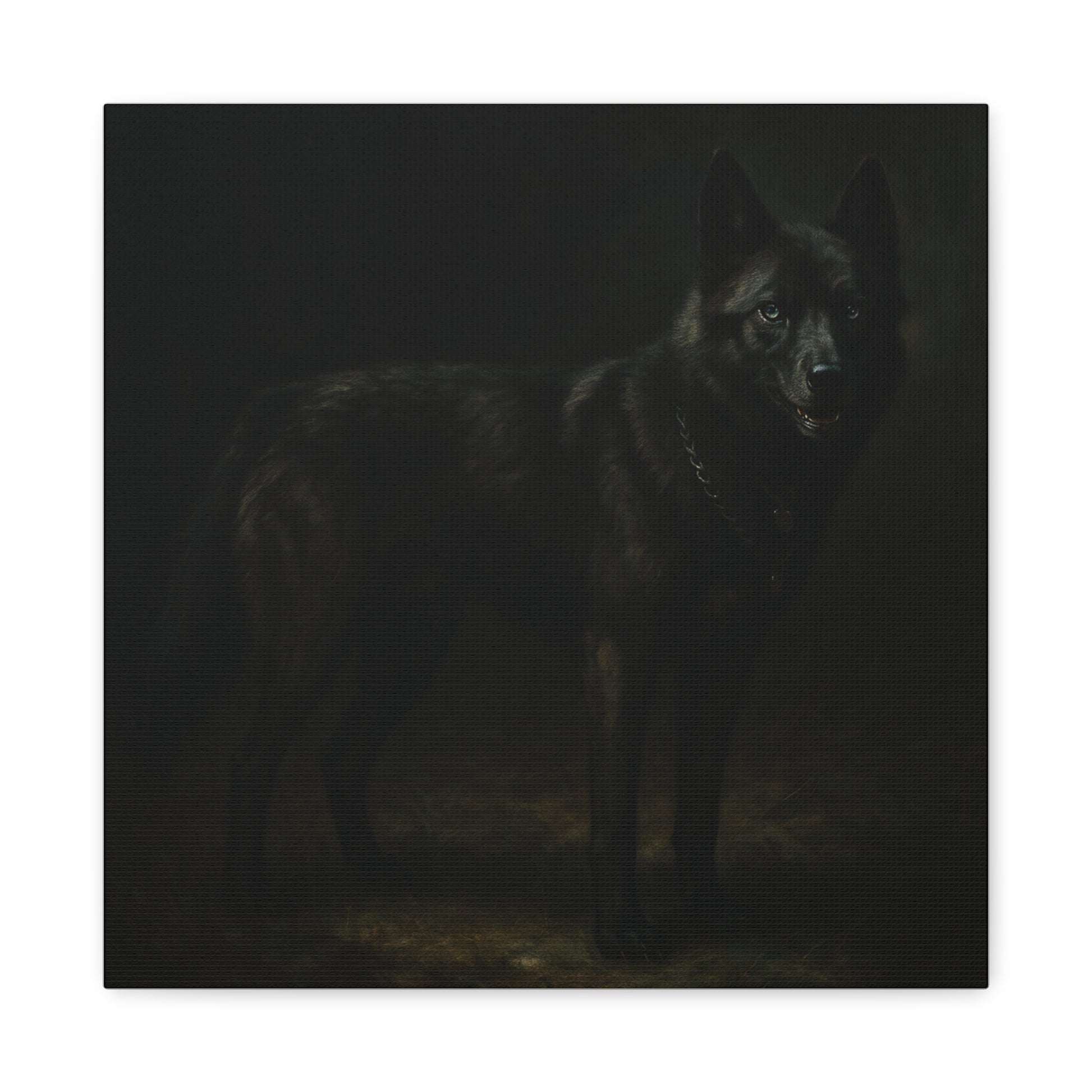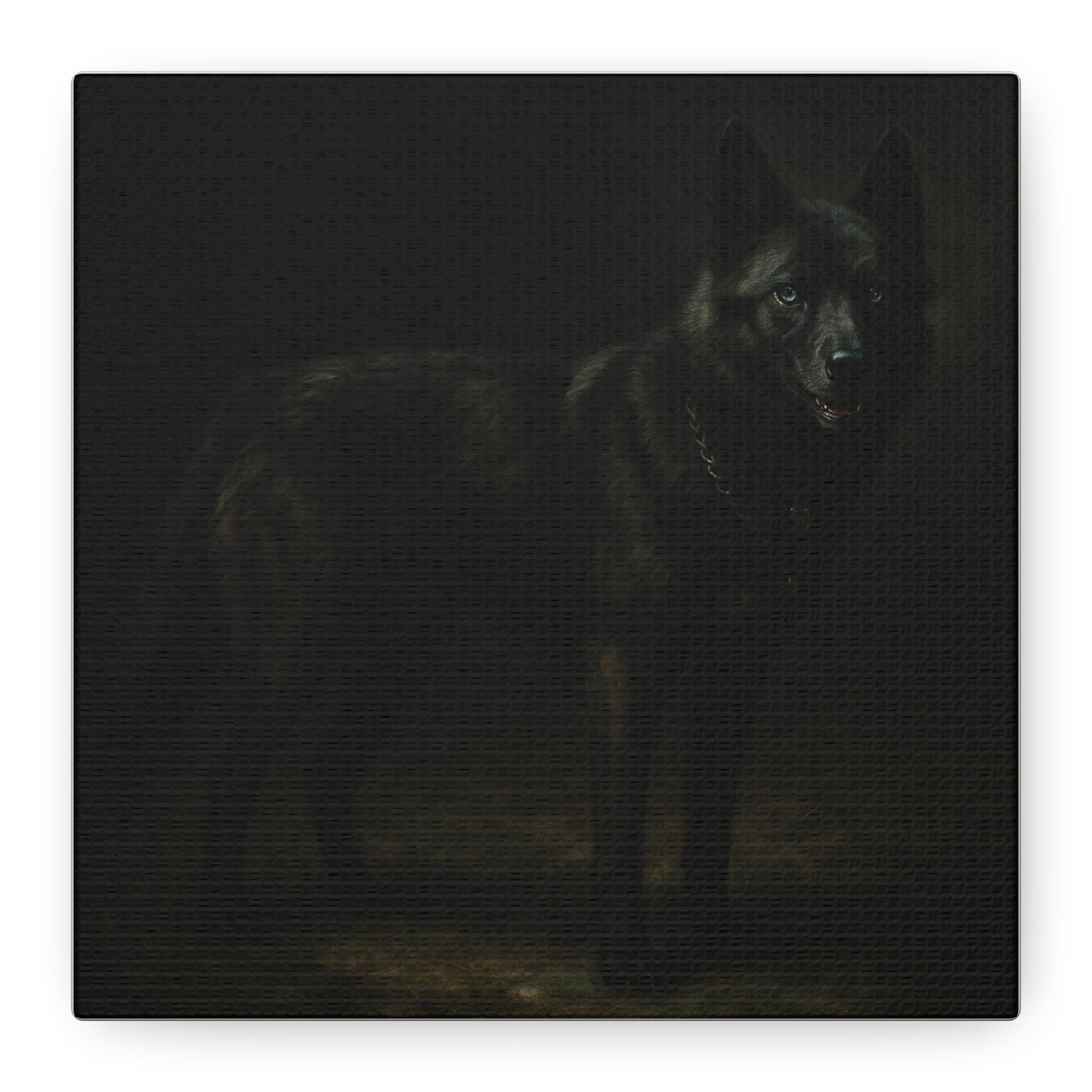 A matte stretched canvas that holds a quiet, powerful presence. The deep, shadowed portrait of a black shepherd emerges from the dark — textured cotton-poly canvas and a subtle matte coating keep glare low and detail rich. Hung in an entryway or study, the piece brings a hush of woodland mystery and steady companionship. It reads like a memory: soft light at the paws, alert eyes catching the room. The natural pine stretcher and back-hanging hardware make installation simple; small rubber feet protect walls and keep the canvas perfectly aligned. Thoughtful production touches — Greenguard Gold-certified inks, non-toxic latex printing, and FSC-sourced pine — let the art feel as responsible as it is atmospheric.