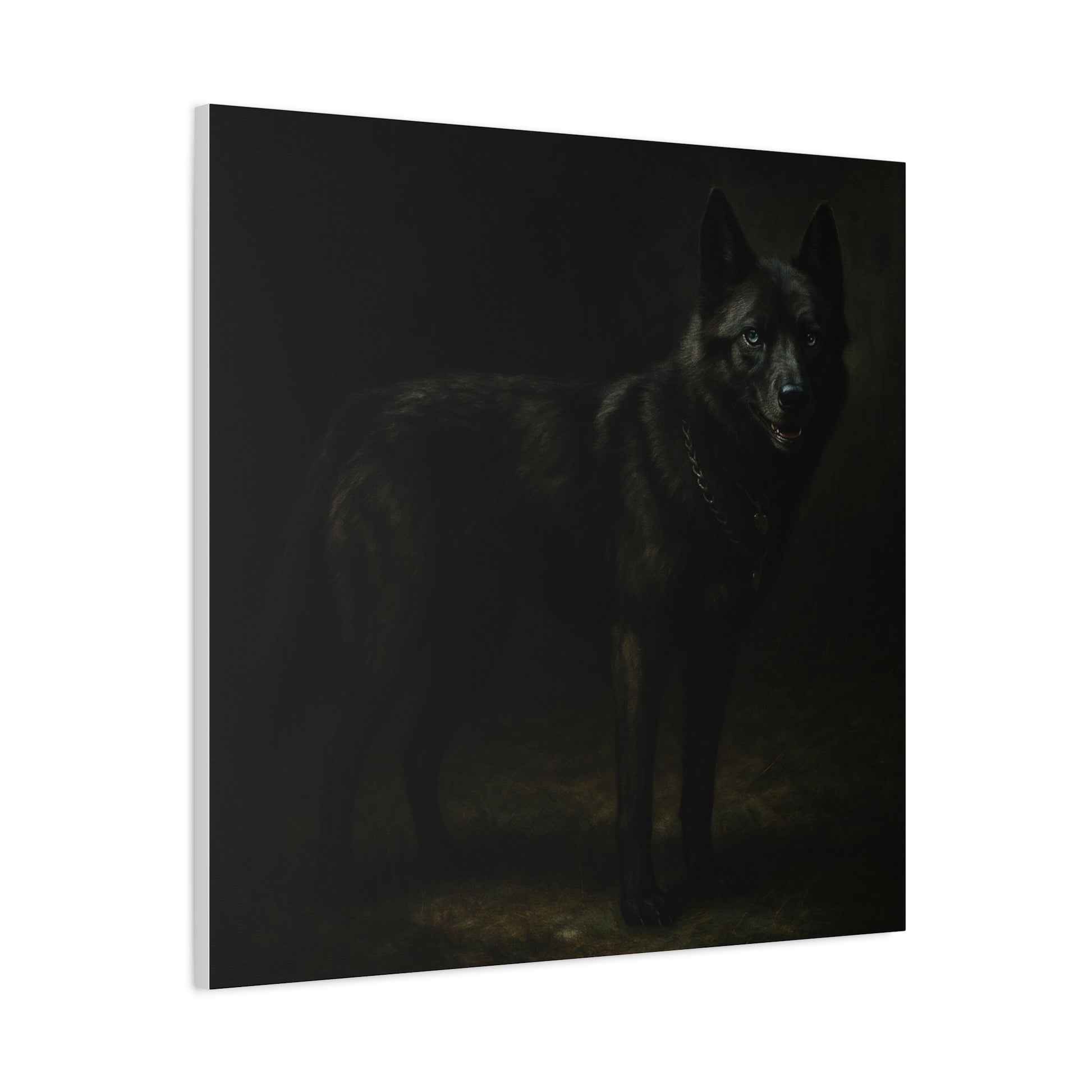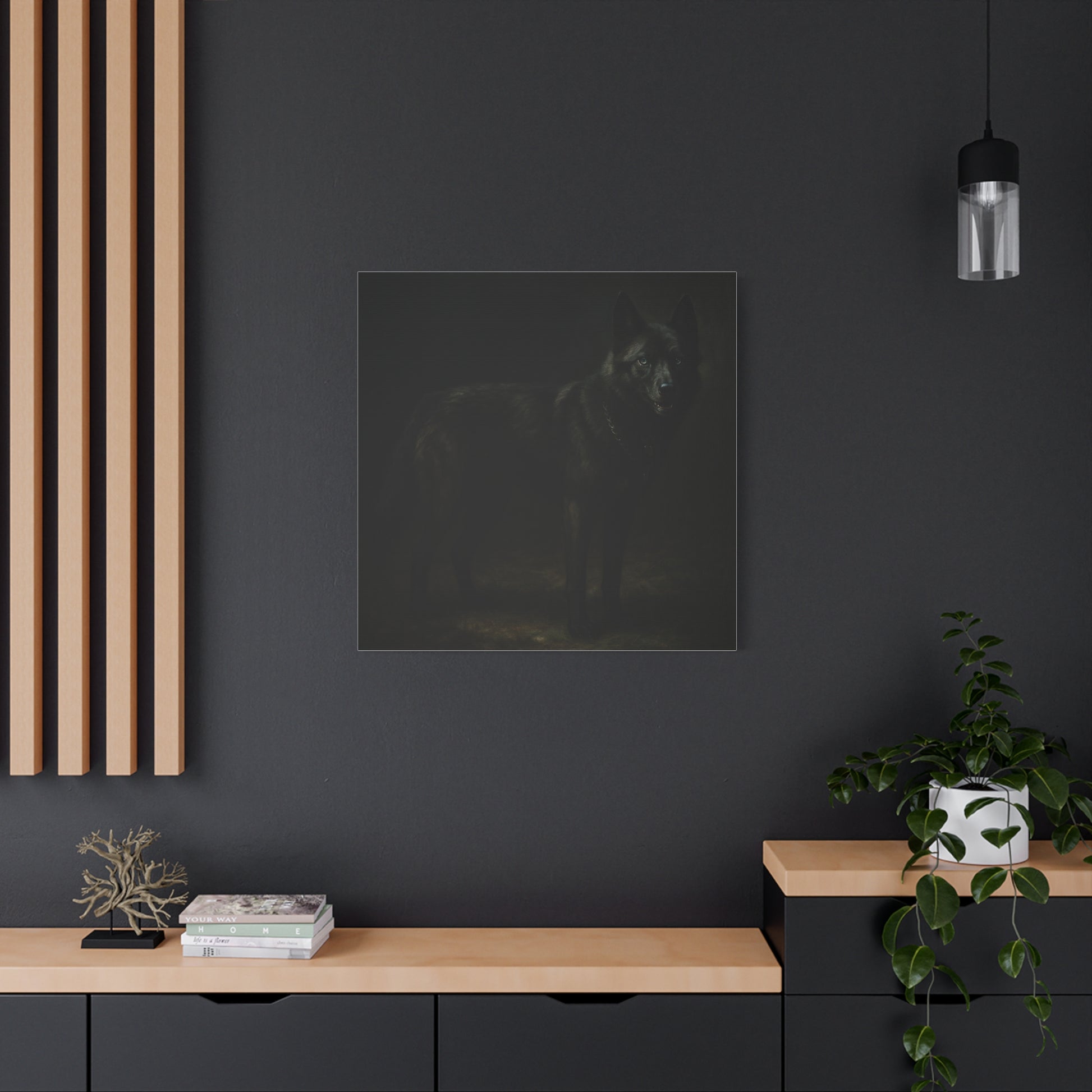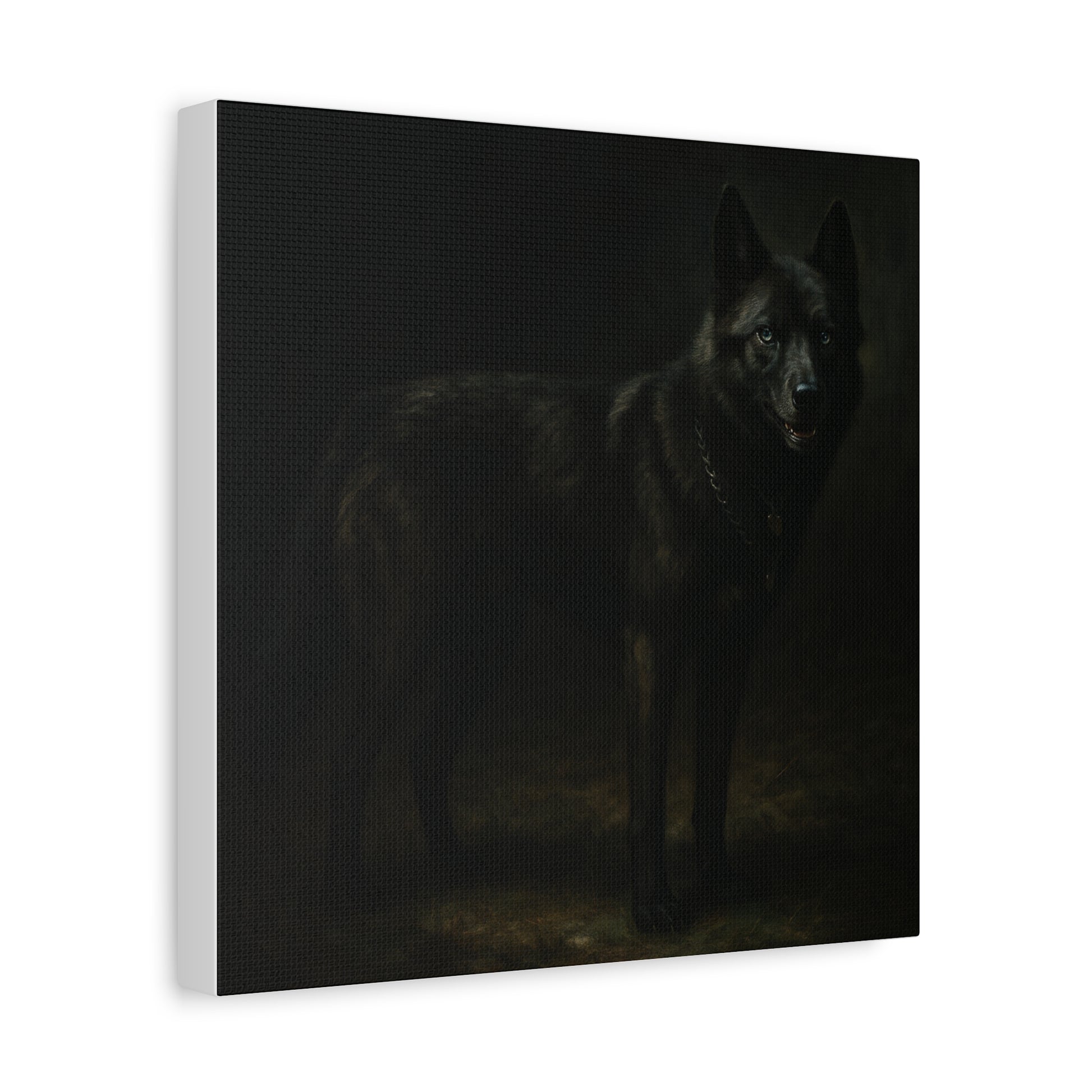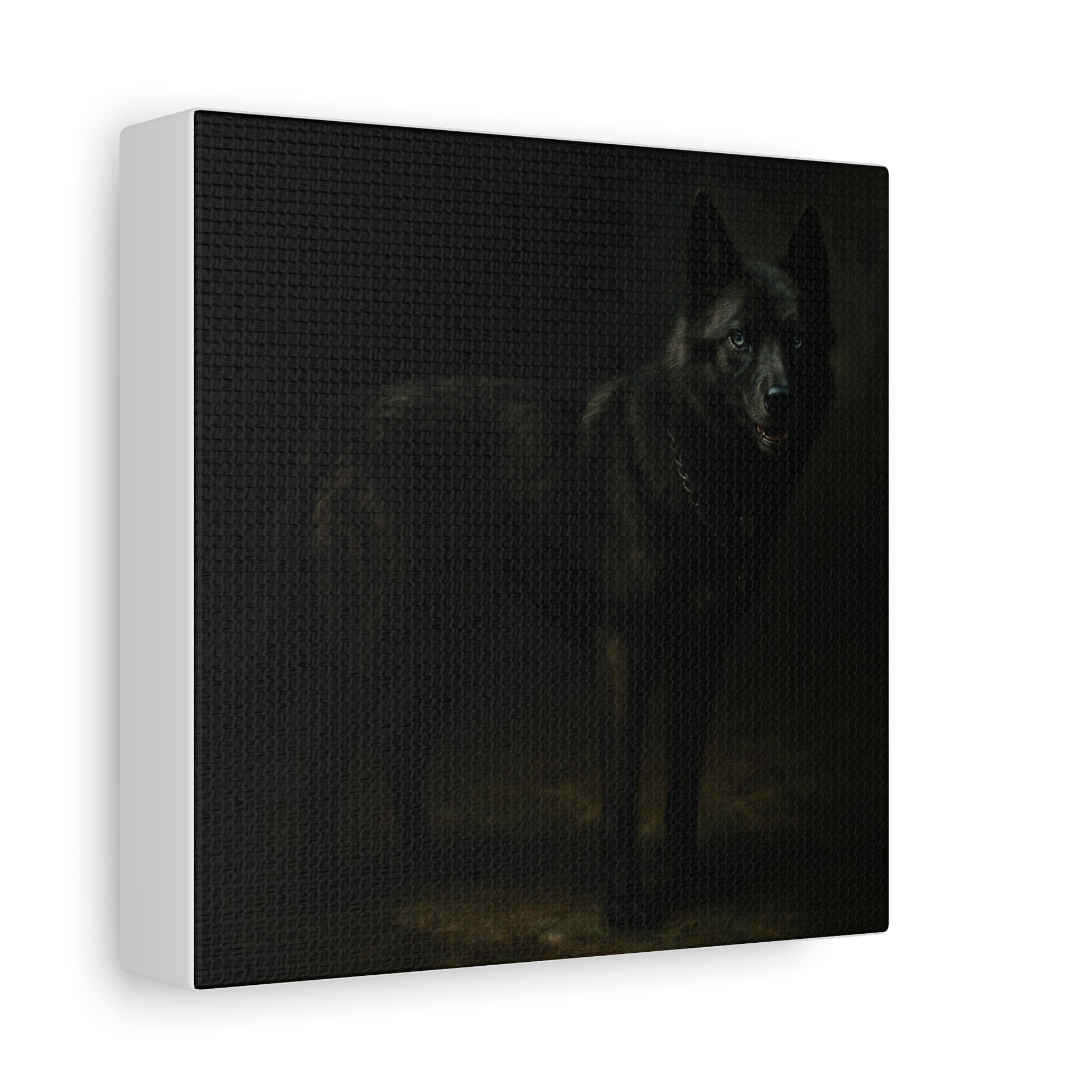 A matte stretched canvas that holds a quiet, powerful presence. The deep, shadowed portrait of a black shepherd emerges from the dark — textured cotton-poly canvas and a subtle matte coating keep glare low and detail rich. Hung in an entryway or study, the piece brings a hush of woodland mystery and steady companionship. It reads like a memory: soft light at the paws, alert eyes catching the room. The natural pine stretcher and back-hanging hardware make installation simple; small rubber feet protect walls and keep the canvas perfectly aligned. Thoughtful production touches — Greenguard Gold-certified inks, non-toxic latex printing, and FSC-sourced pine — let the art feel as responsible as it is atmospheric.