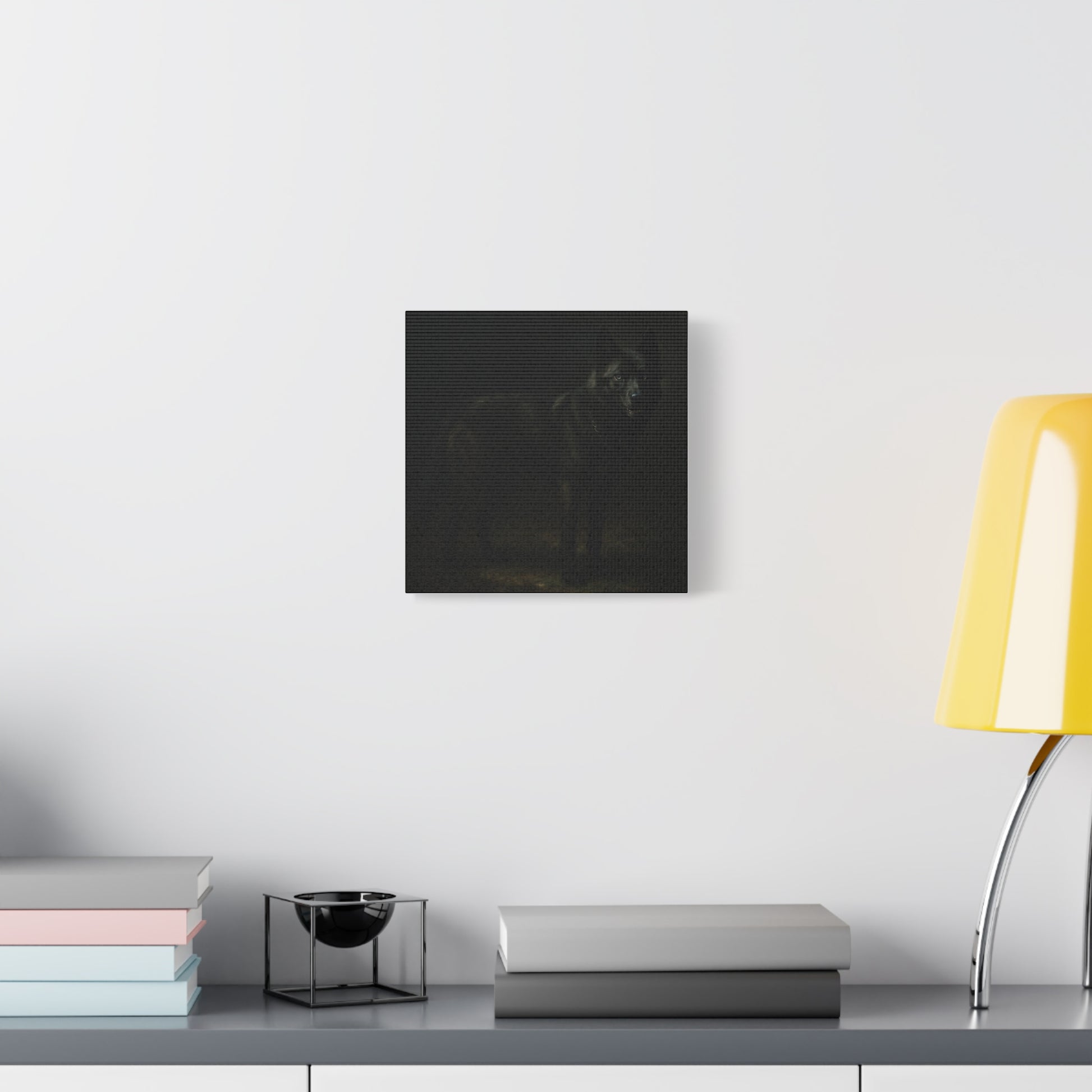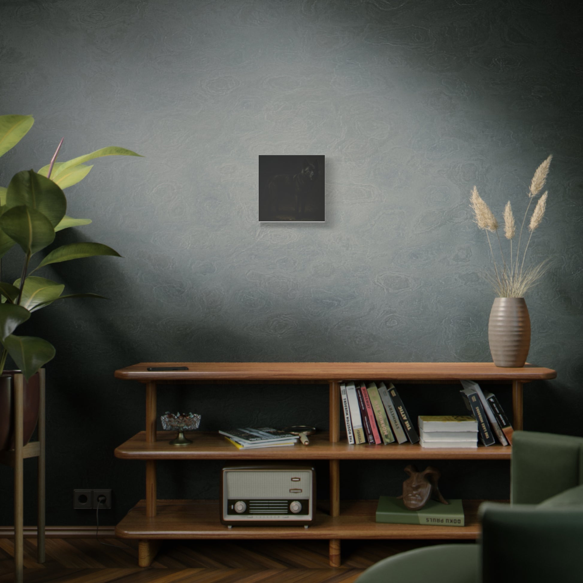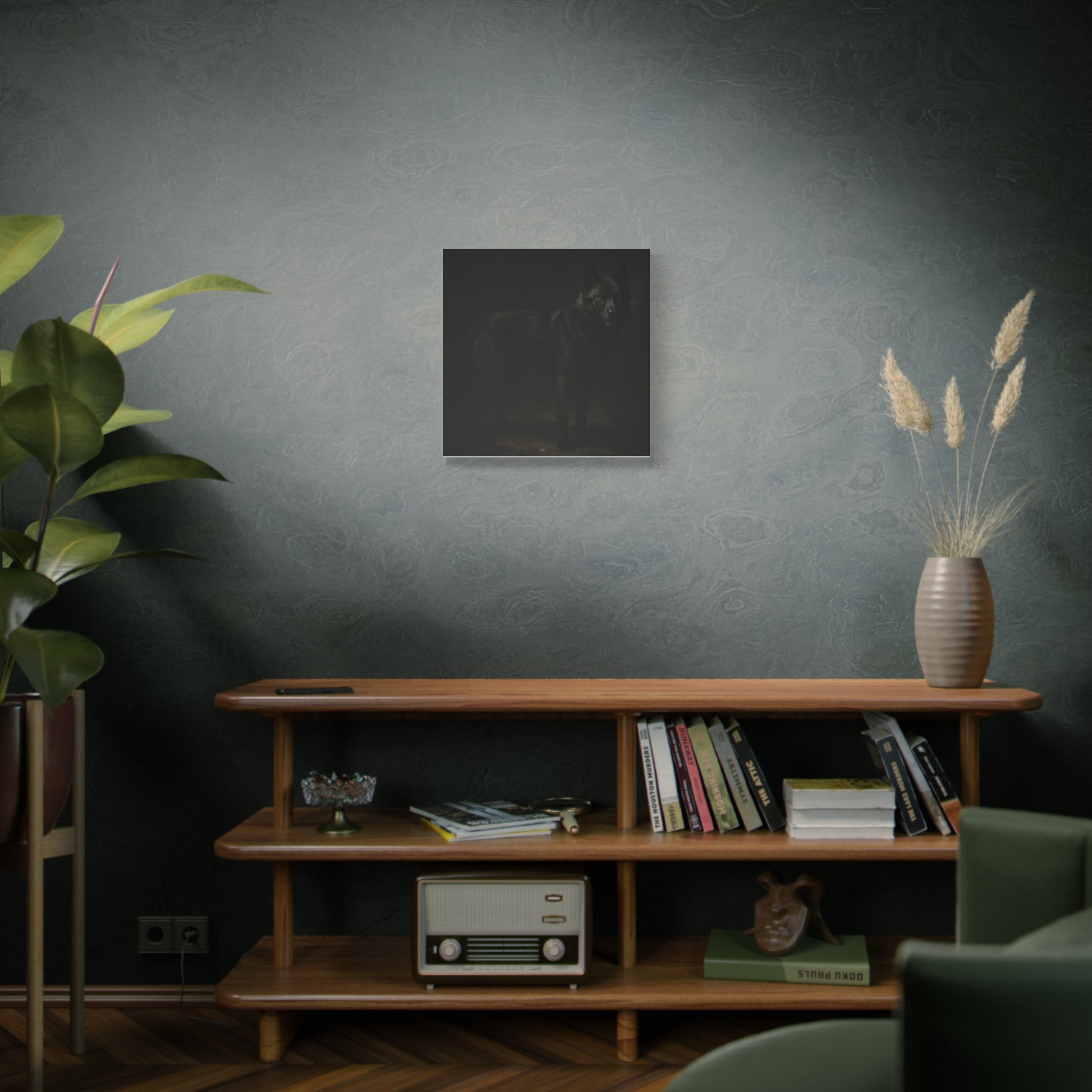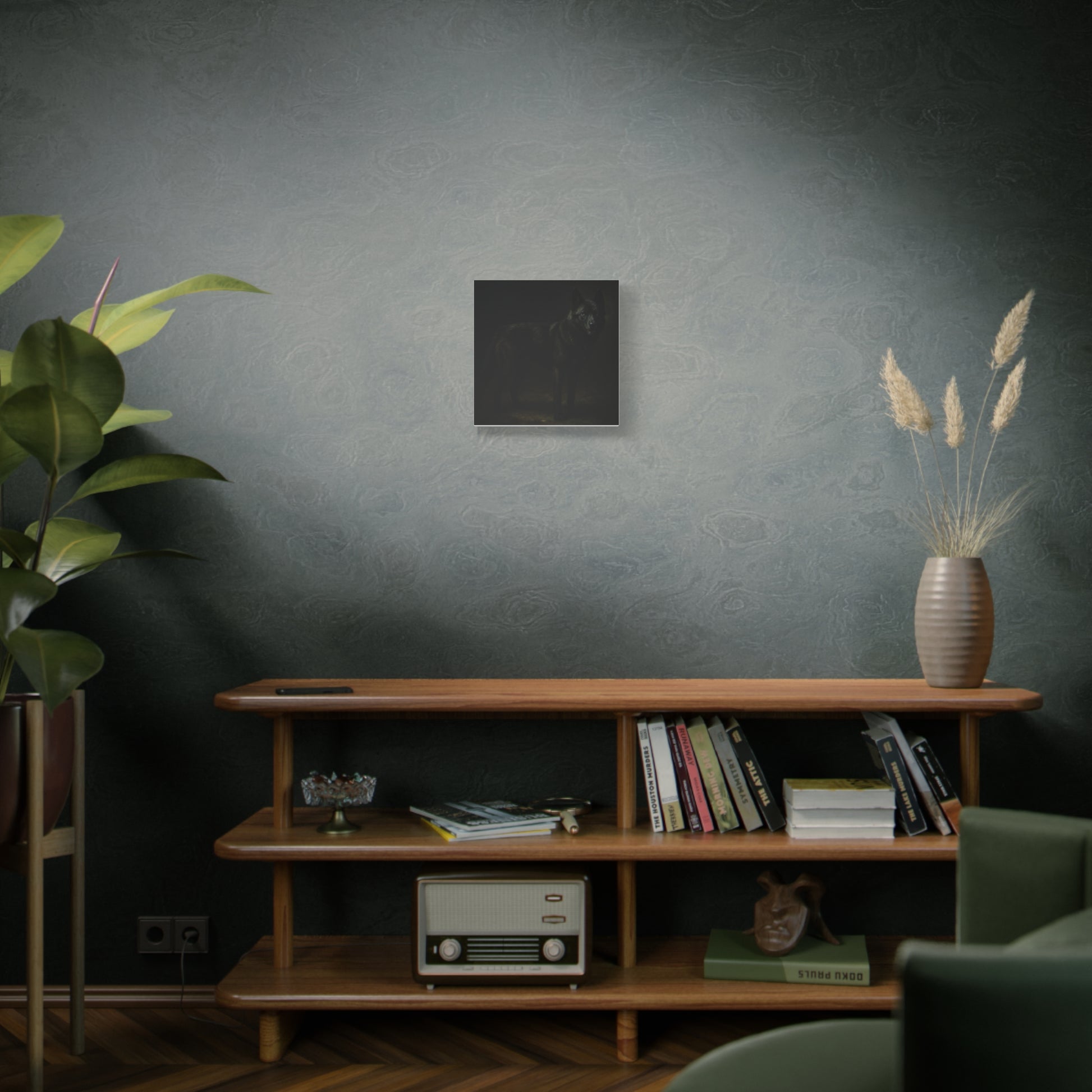 A matte stretched canvas that holds a quiet, powerful presence. The deep, shadowed portrait of a black shepherd emerges from the dark — textured cotton-poly canvas and a subtle matte coating keep glare low and detail rich. Hung in an entryway or study, the piece brings a hush of woodland mystery and steady companionship. It reads like a memory: soft light at the paws, alert eyes catching the room. The natural pine stretcher and back-hanging hardware make installation simple; small rubber feet protect walls and keep the canvas perfectly aligned. Thoughtful production touches — Greenguard Gold-certified inks, non-toxic latex printing, and FSC-sourced pine — let the art feel as responsible as it is atmospheric.